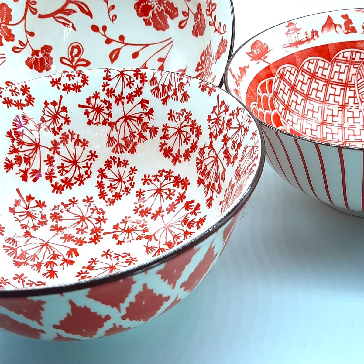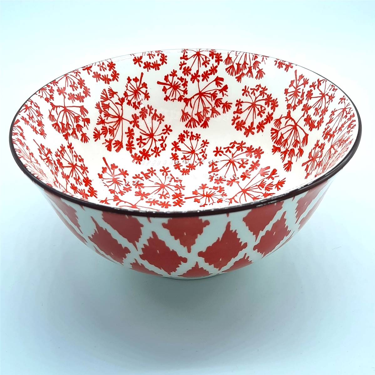 A la croisée du design moderne et de l’élégance asiatique, ce bol offre à l’intérieur un délicat jardin de fleurs rouges se déployant sur un fond blanc lumineux