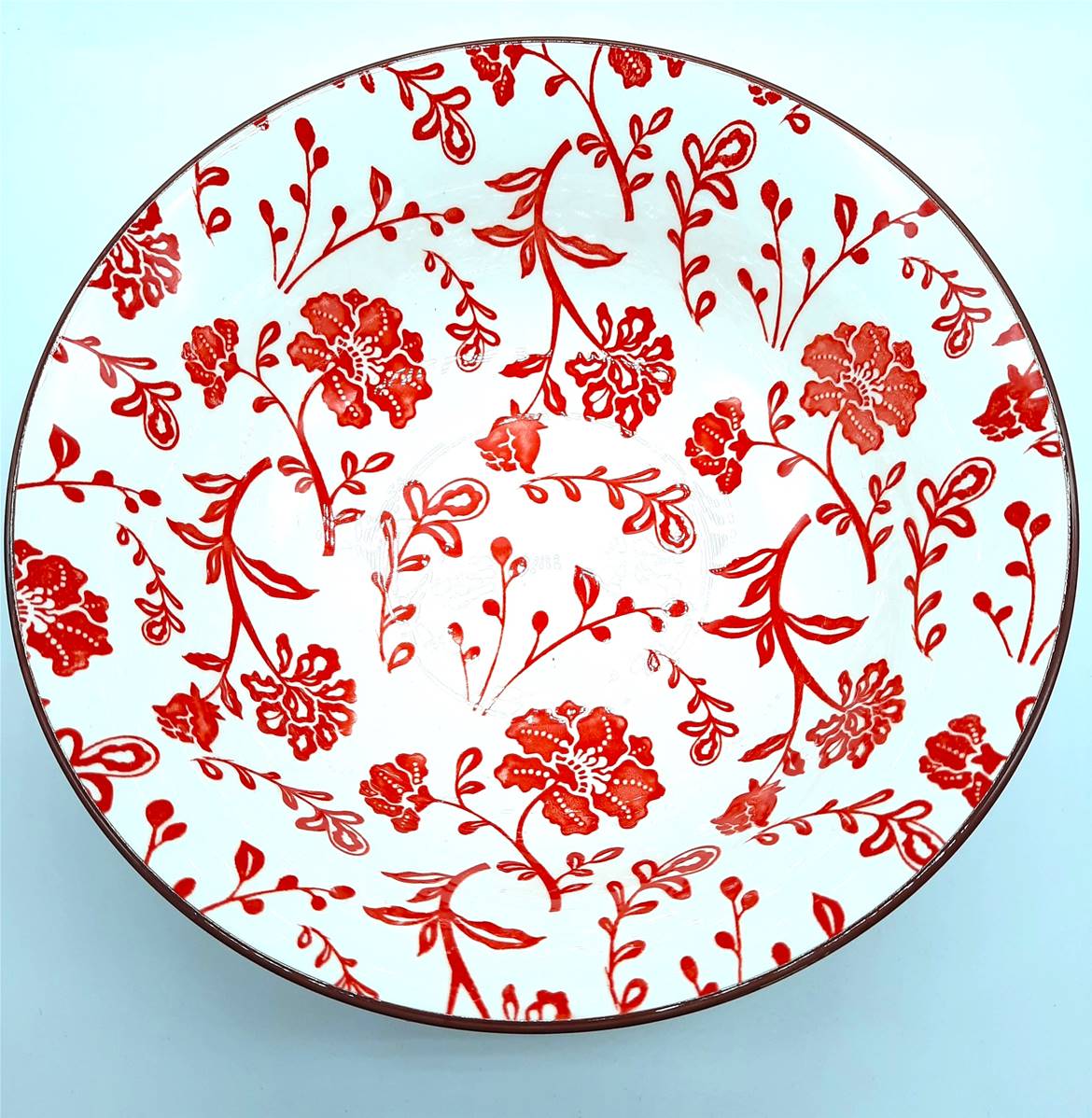 À l’intérieur, un délicat décor floral rouge s’épanouit sur fond blanc, tandis qu’à l’extérieur, un motif graphique rouge géométrique souligne le raffinement du design. Une pièce de vaisselle à la fois poétique, artisanale et intemporelle.