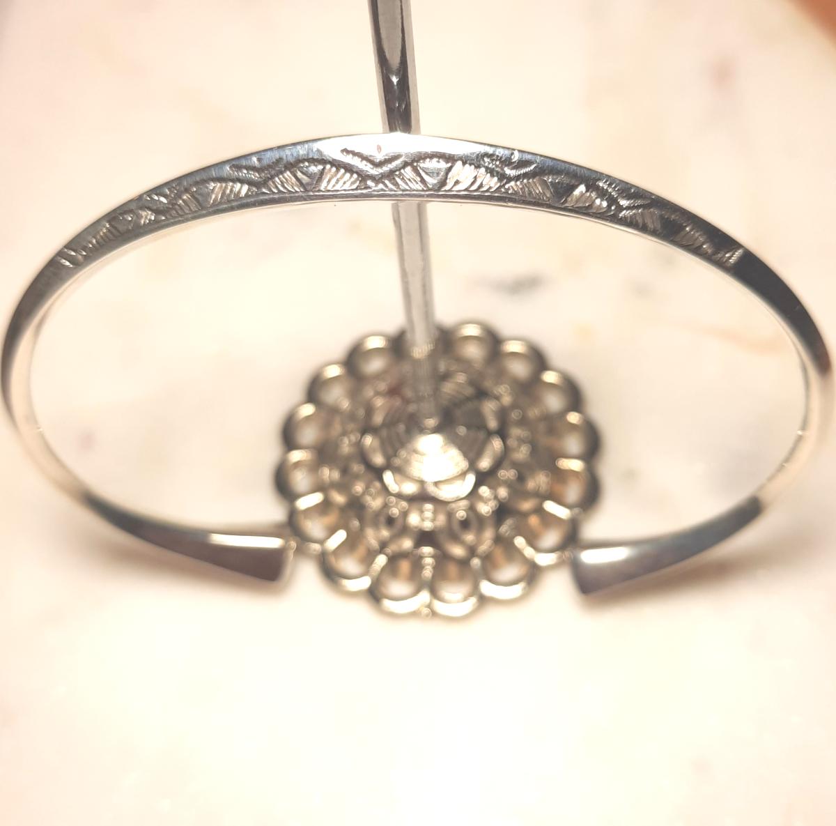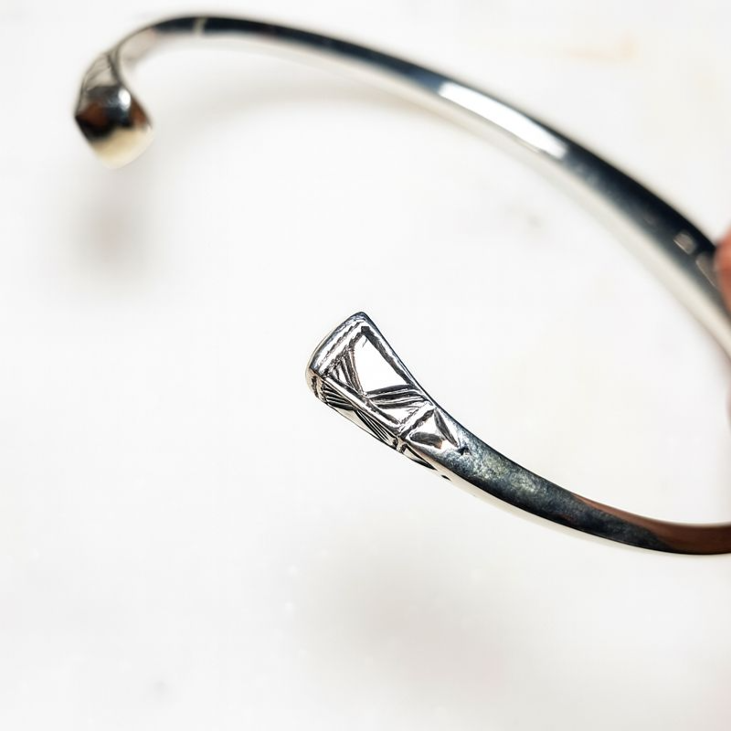 Bracelet touareg , ses motifs sont gravés ou poinçonnés à la main, la signature de l'artisan est à l'intérieur.