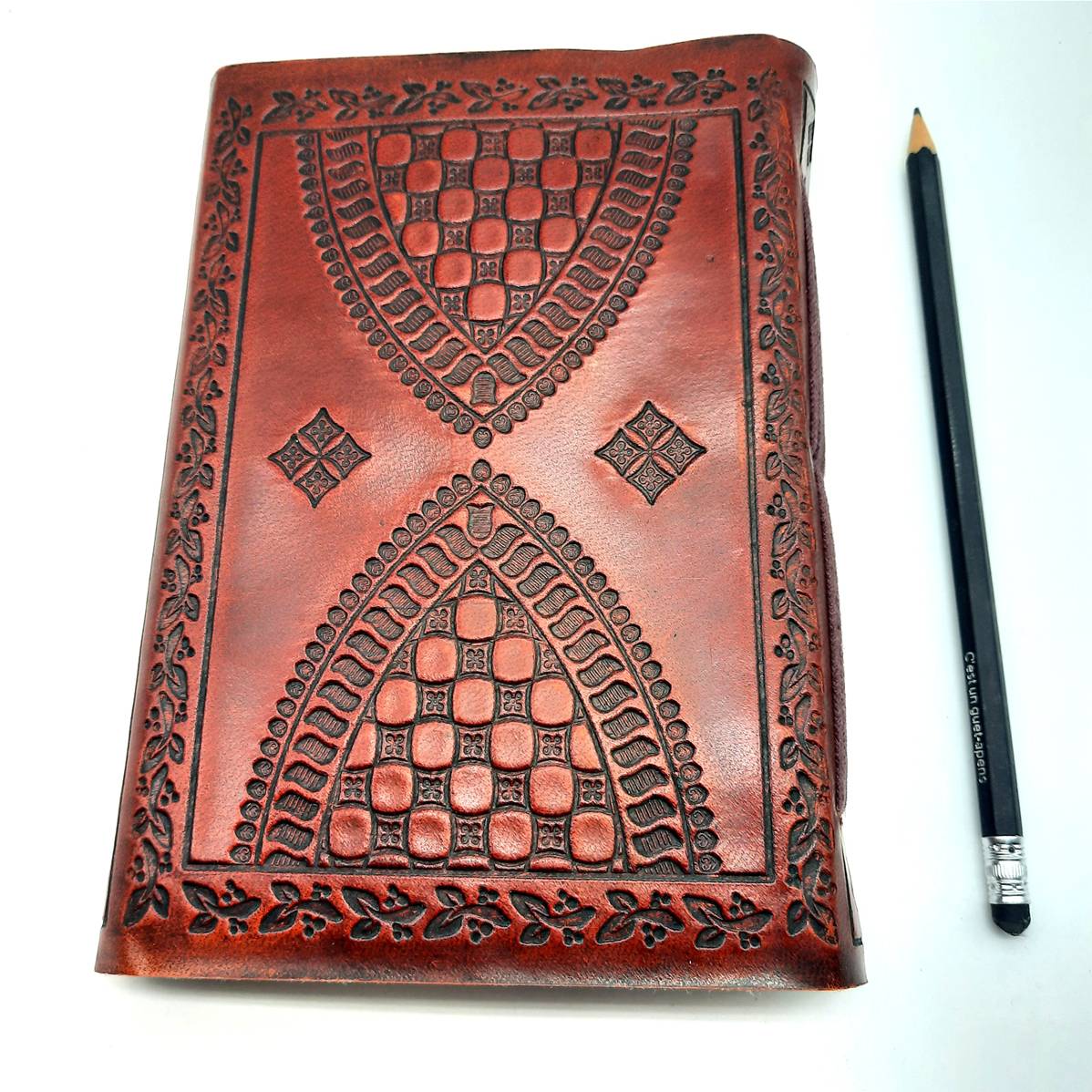 Ce carnet de voyage en cuir est fabriqué à la main par des artisans de Jaipur, en Inde. Chaque pièce est unique, avec des motifs embossés traditionnels et une finition authentique.