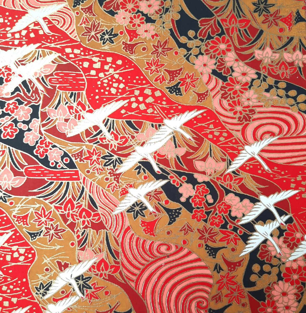 Papier sérigraphié à la main depuis l'époque Edo (18éme siècle) traditionnellement à partir de motifs de kimonos.
