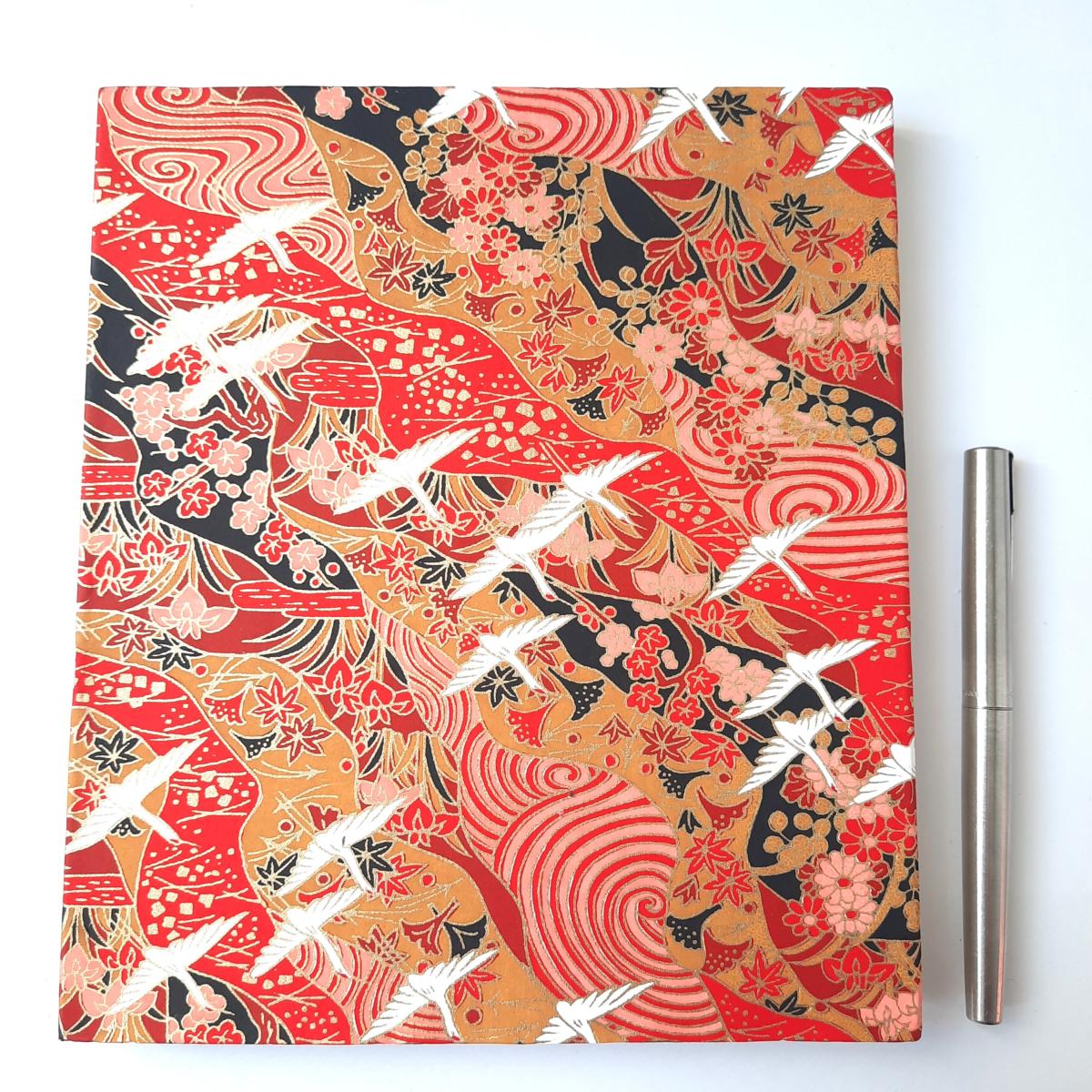 Carnet en papier japonais Grues sur fond rouge et noir
