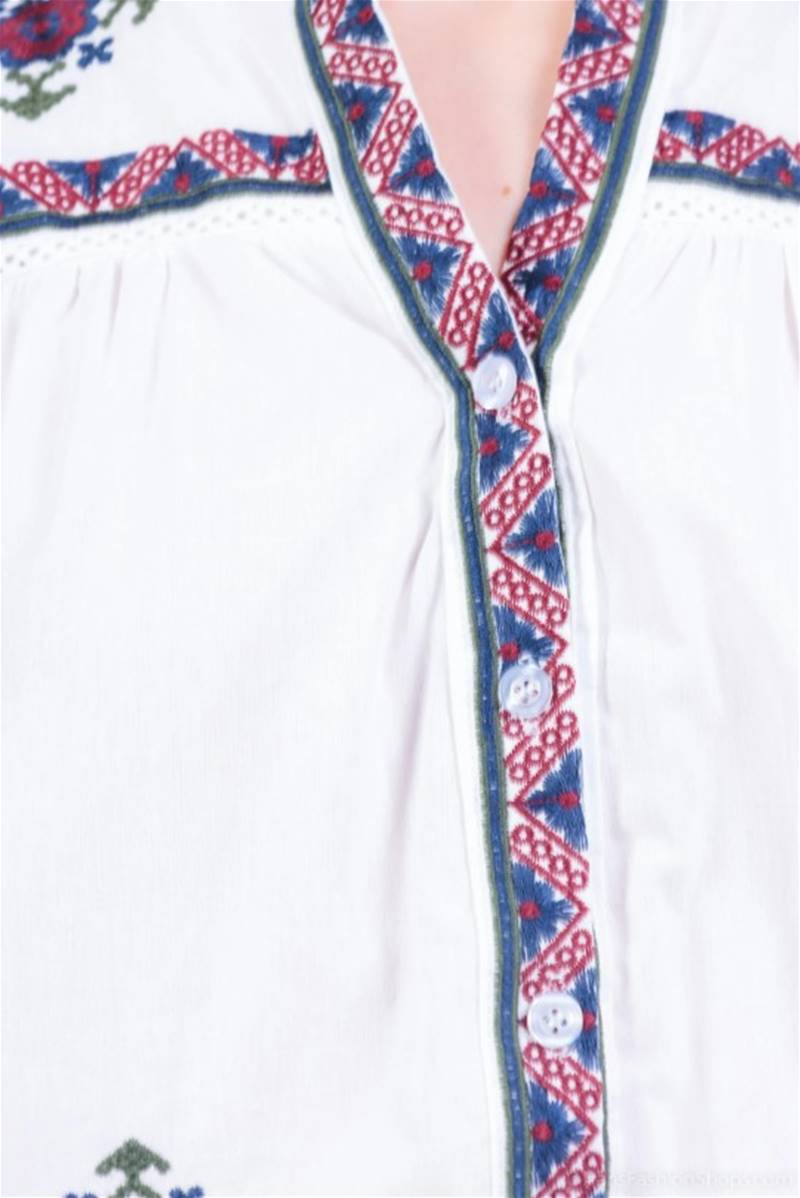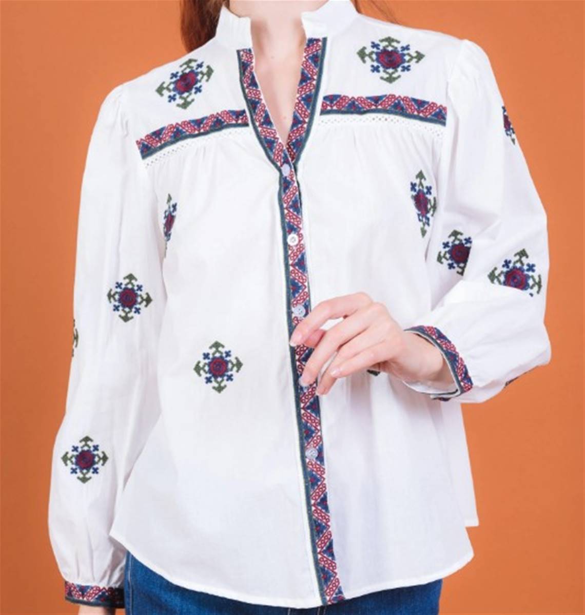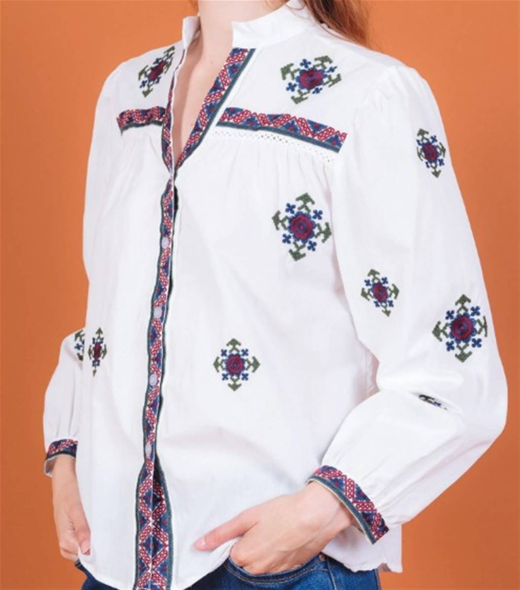 Un chemisier brodé plein de charme et d’authenticité, où le blanc pur du coton rencontre l’éclat des broderies colorées pour un style bohème raffiné.