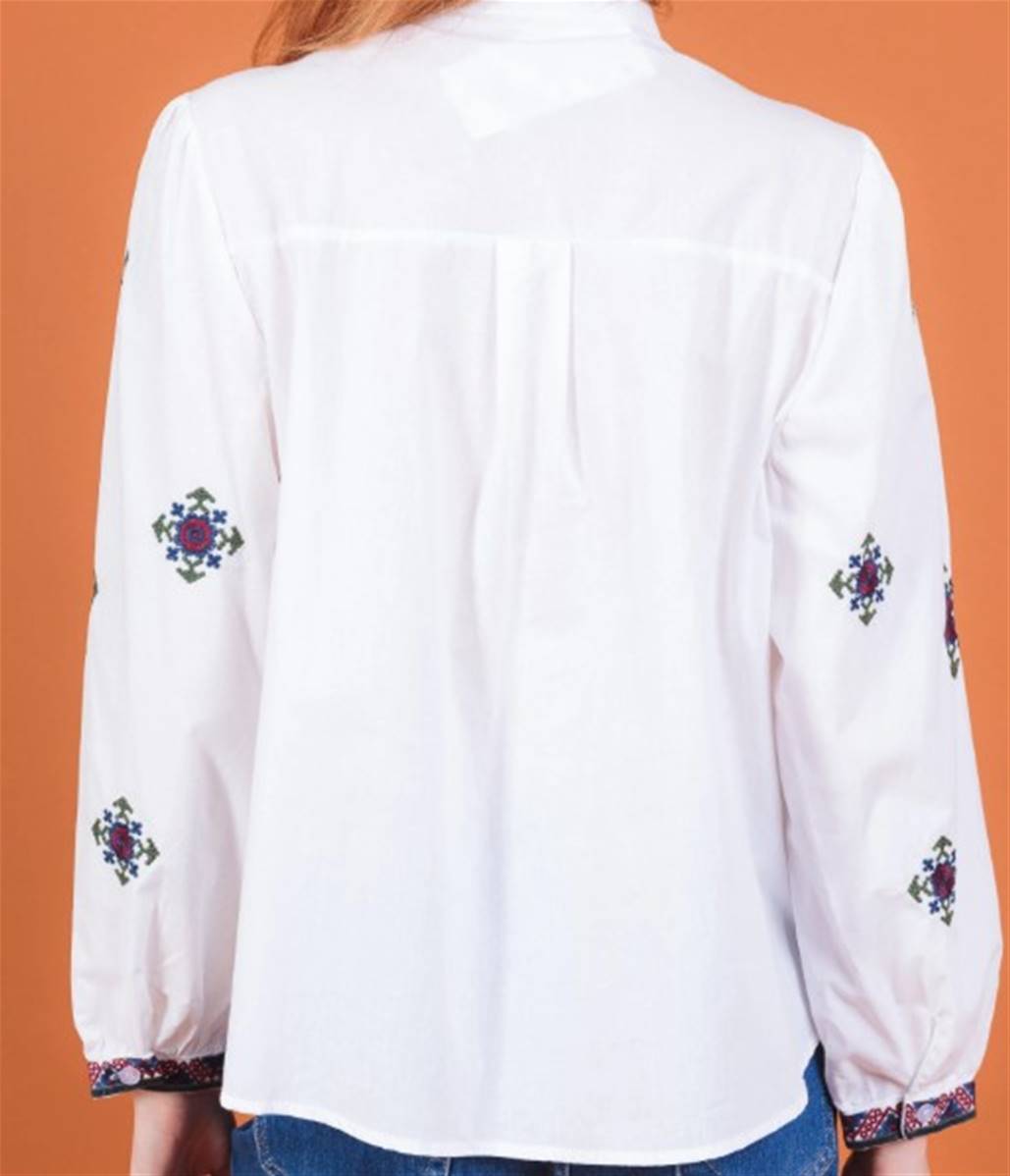 Ce chemisier blanc 100 % coton séduit par ses broderies délicates et ses finitions colorées. Chaque détail, du col à la patte de boutonnage, est souligné par de subtils motifs rouges et bleus inspirés des savoir-faire traditionnels.