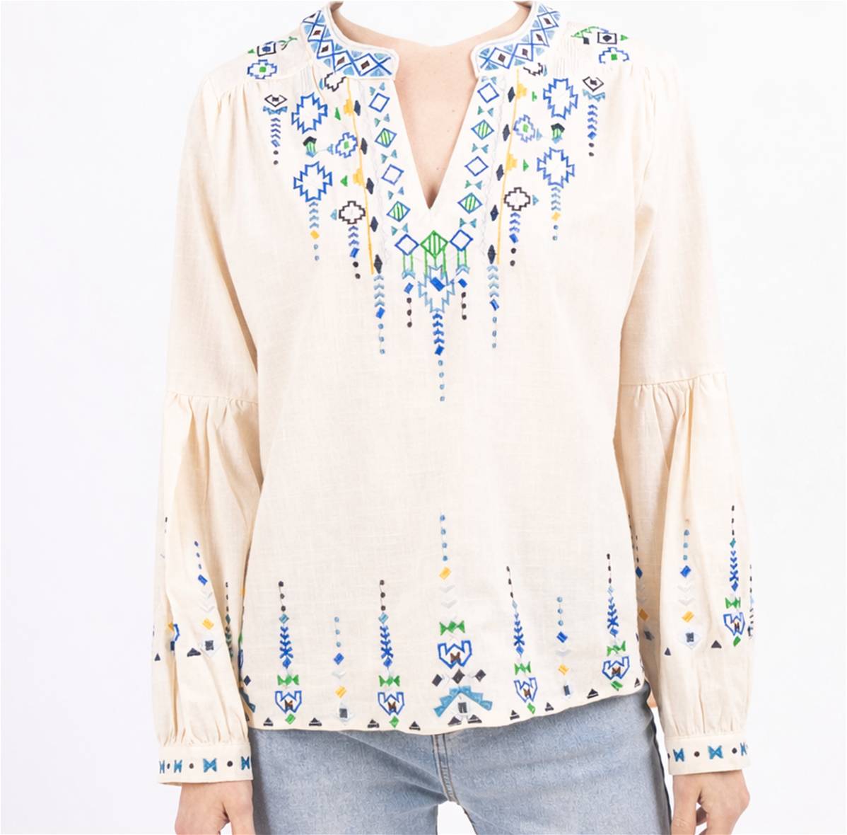 Cette chemise fantaisie se distingue par ses broderies graphiques aux influences ethniques, délicatement travaillées autour de l’encolure et sur les manches.