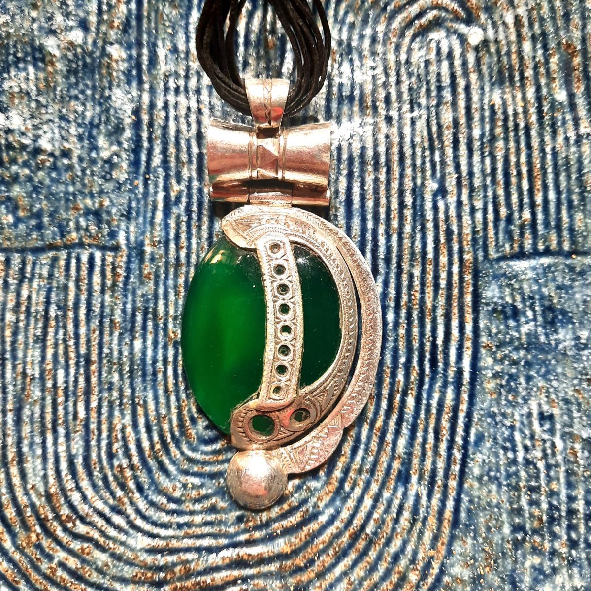 Offrez vous ce ravissant collier touareg en argent avec cette belle pierre verte sertie au milieu du pendentif.