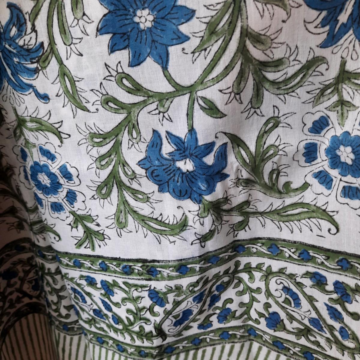 Son tissu est 100% coton, fabriqué en Inde, imprimé à la main selon la technique du " block print" ou impression au bloc de bois. Ce savoir-faire ancestral est carractéristique du Rajasthan qui consiste à imprimer manuellement le tissu grâce à des tampons de bois sculptés à la main.