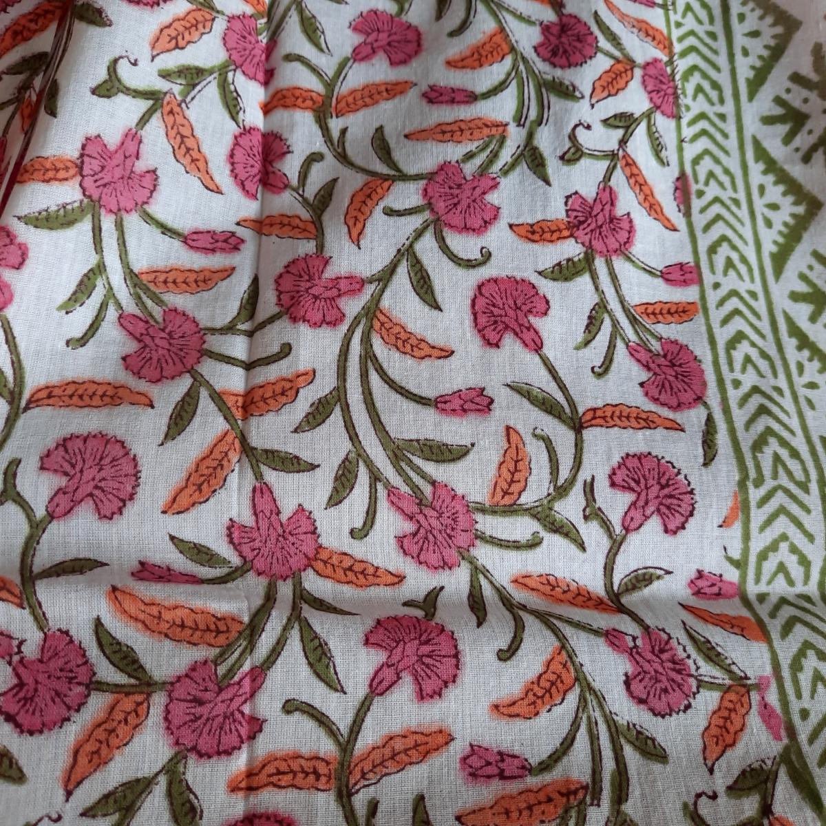 Son tissu est 100% coton, fabriqué en Inde, imprimé à la main selon la technique du " block print" ou impression au bloc de bois. Ce savoir-faire ancestral est carractéristique du Rajasthan qui consiste à imprimer manuellement le tissu grâce à des tampons de bois sculptés à la main.