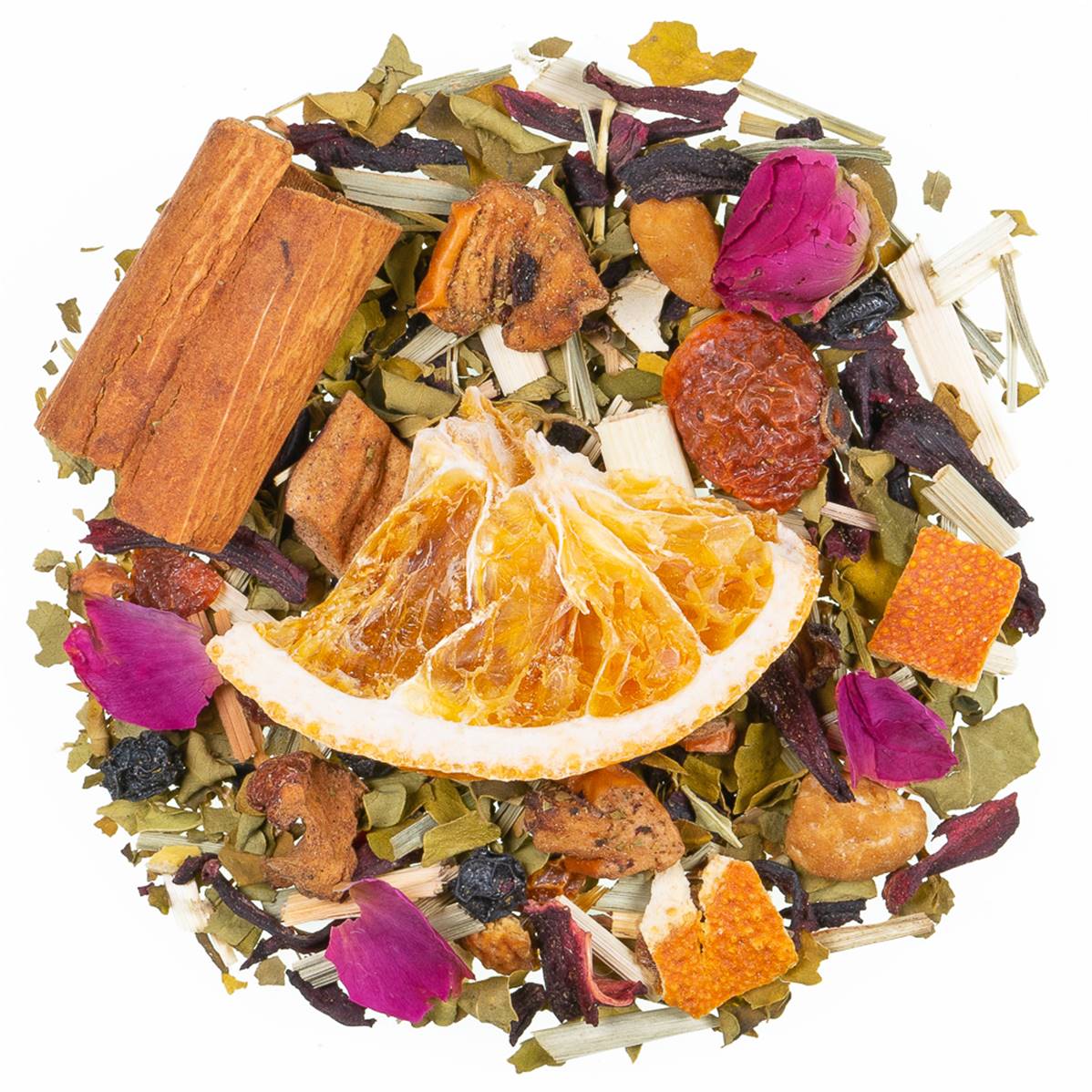 Ingrédients : fleurs d’hibiscus, feuilles de moringa (20 %), morceaux de pomme (15 %), citronnelle, écorces d’orange, arôme, morceaux d’orange, écorces de cynorrhodon, bâton de cannelle (4 %), baies de sureau, amandes grillées (amandes, sucre caramélisé) (2 %), boutons de rose, pétales de rose