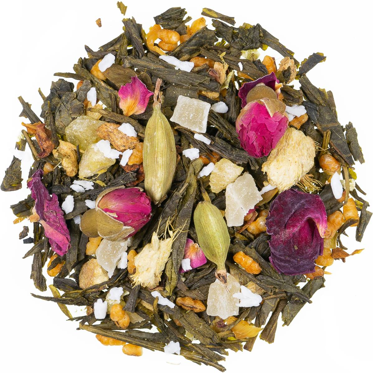 Ingrédients : thé vert de Chine Sencha, morceaux de gingembre, riz grillé, morceaux de mangue confite (mangue, sucre), morceaux d’ananas confit (ananas, sucre) (6,5 %), noix de coco râpée, arôme, morceaux de papaye confite (papaye, sucre), cardamome, pousses de bambou(2%), pétales de rose, boutons de rose