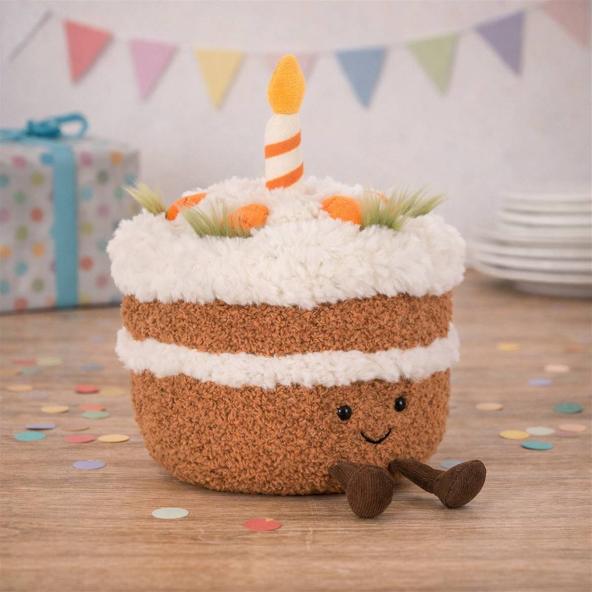 Un gâteau d’anniversaire Carrot cake Jellycat tendre et décalé, parfait pour un cadeau original, festif et plein de douceur.