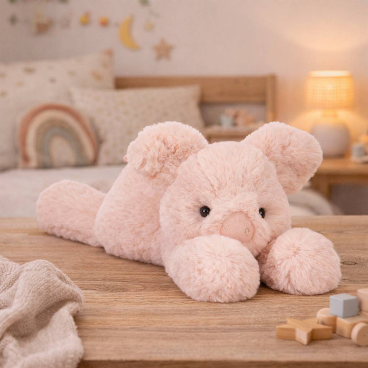 Avec sa teinte rose poudré, ses petites oreilles rondes et son museau délicatement brodé, elle incarne la douceur et l’innocence.