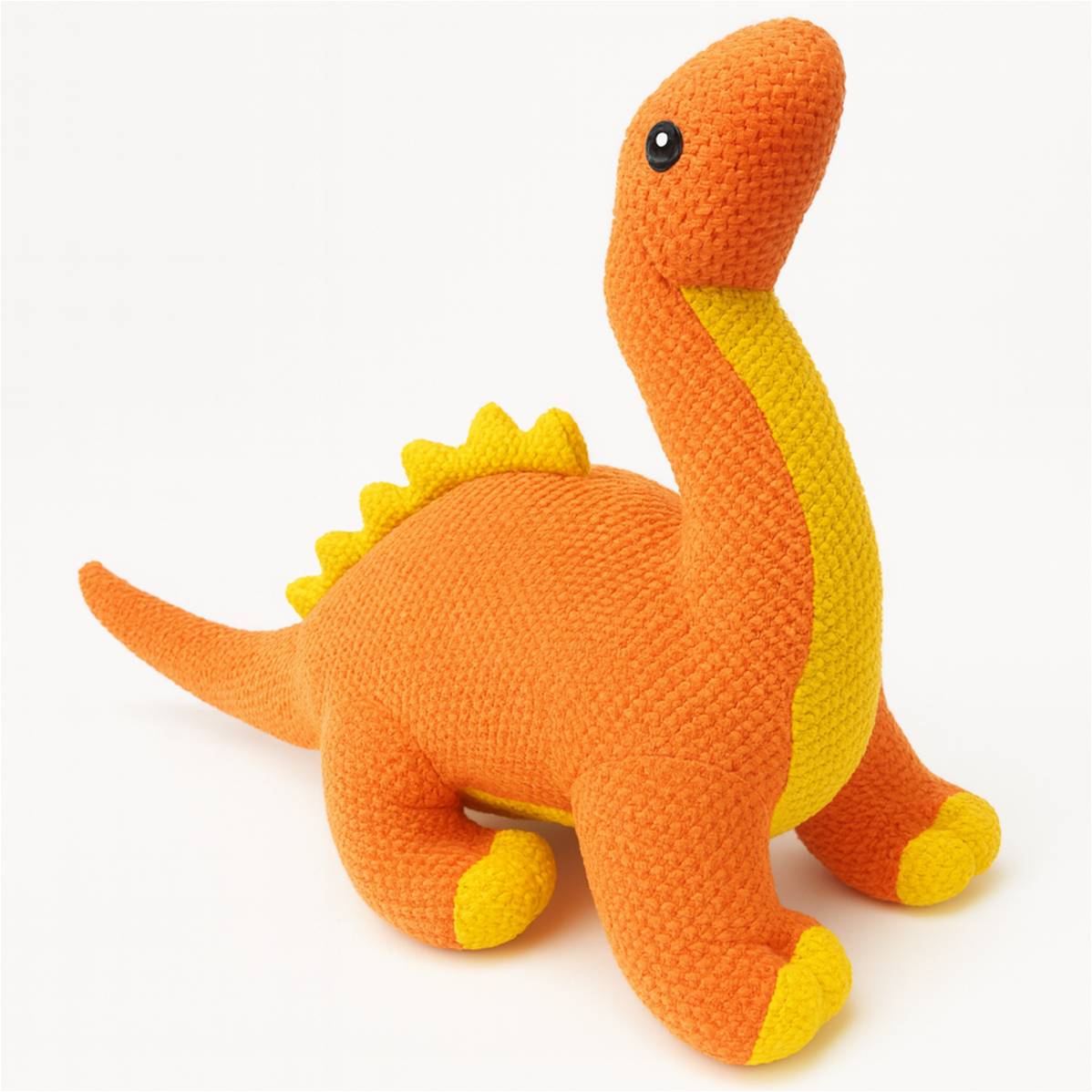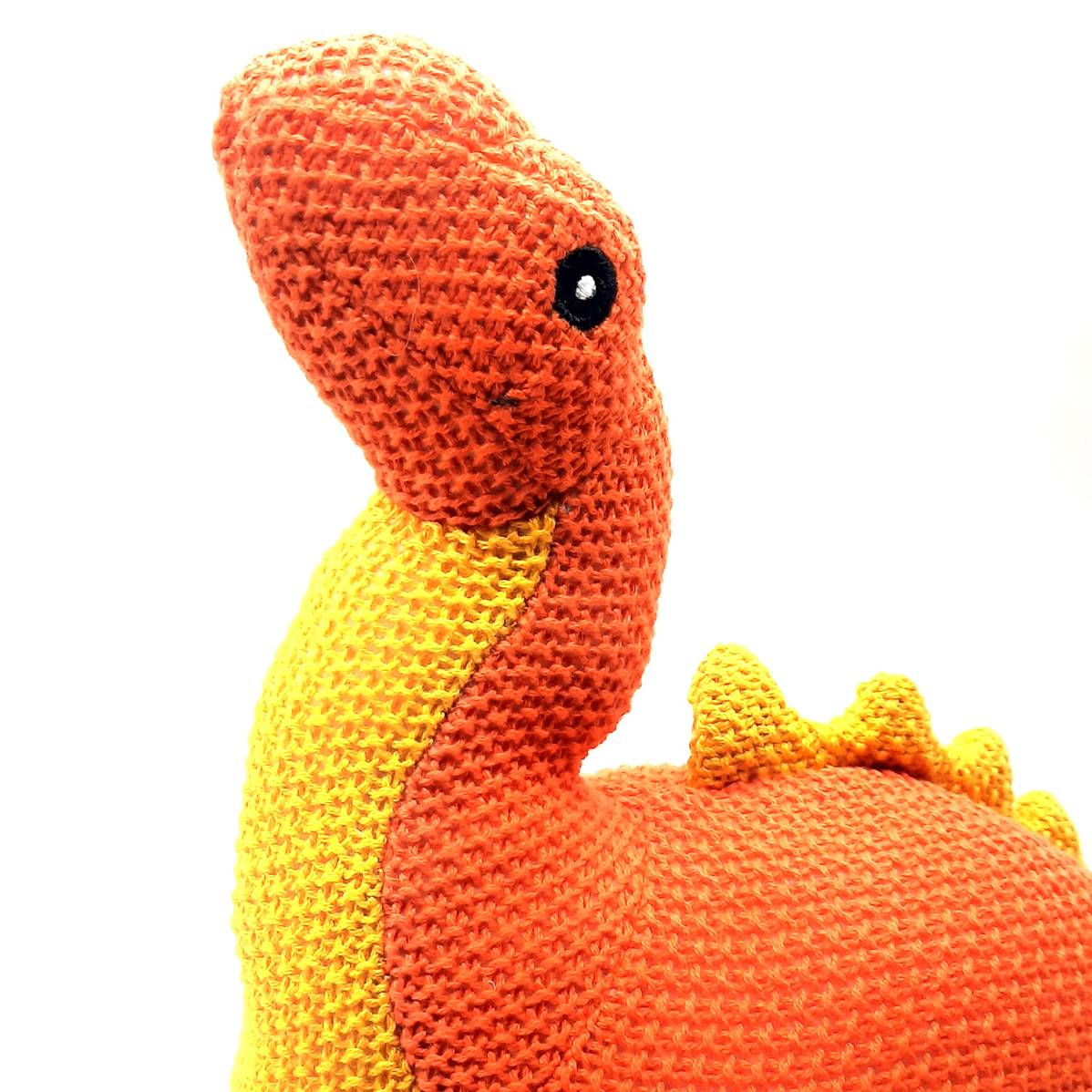 Un diplodocus orange en tissu crochet, doux, original et plein de charme rétro. Sa forme allongée, son look sympathique et sa couleur vive en font un compagnon idéal pour petits et grands.