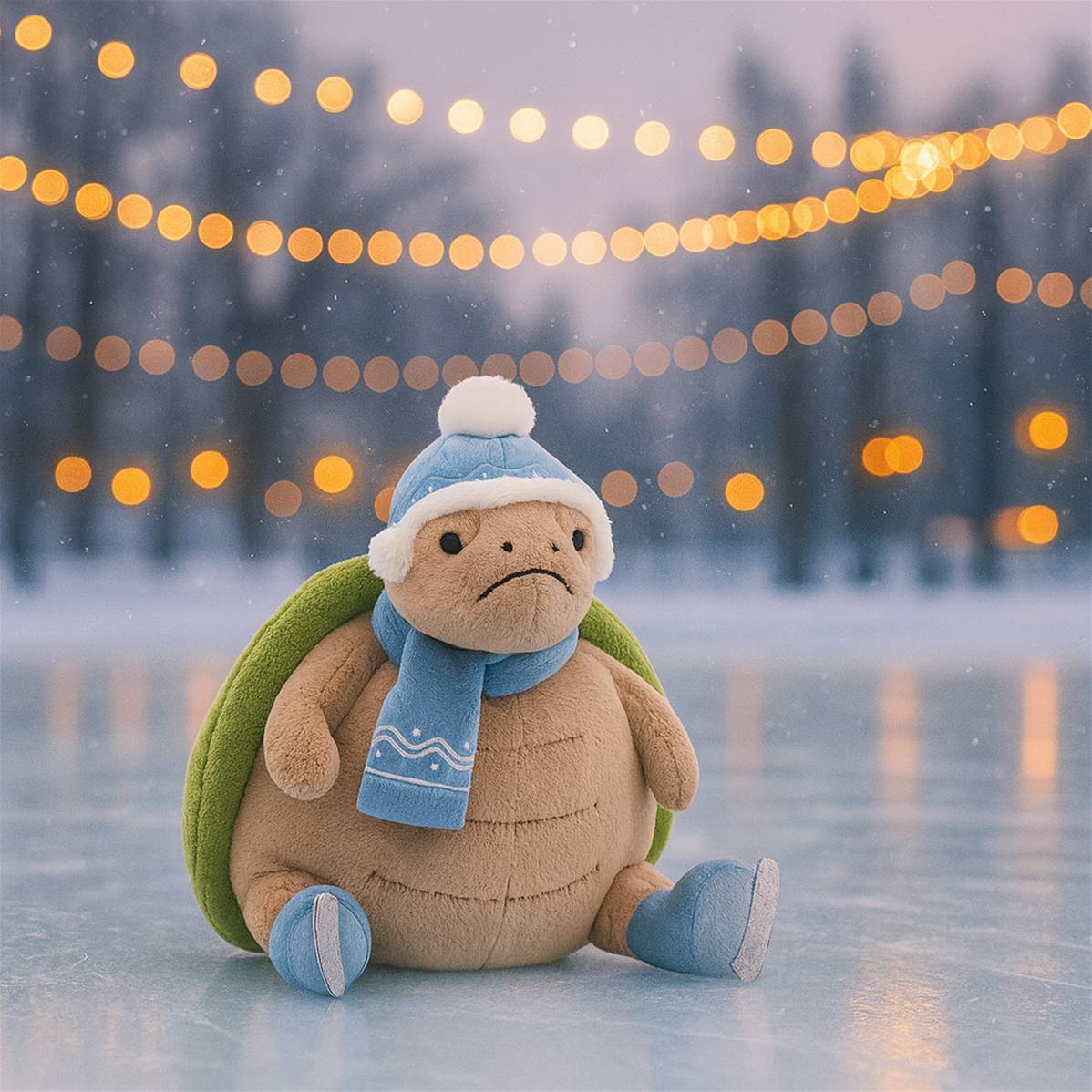 Armé de ses petits patins, de son bonnet à pompon et de son écharpe douillette, il glisse sur la glace avec tout le sérieux du monde. Même s’il préfère les siestes au bord de l’eau, Timmy s’est laissé convaincre de participer à l’esprit de Noël – et il le fait avec style.