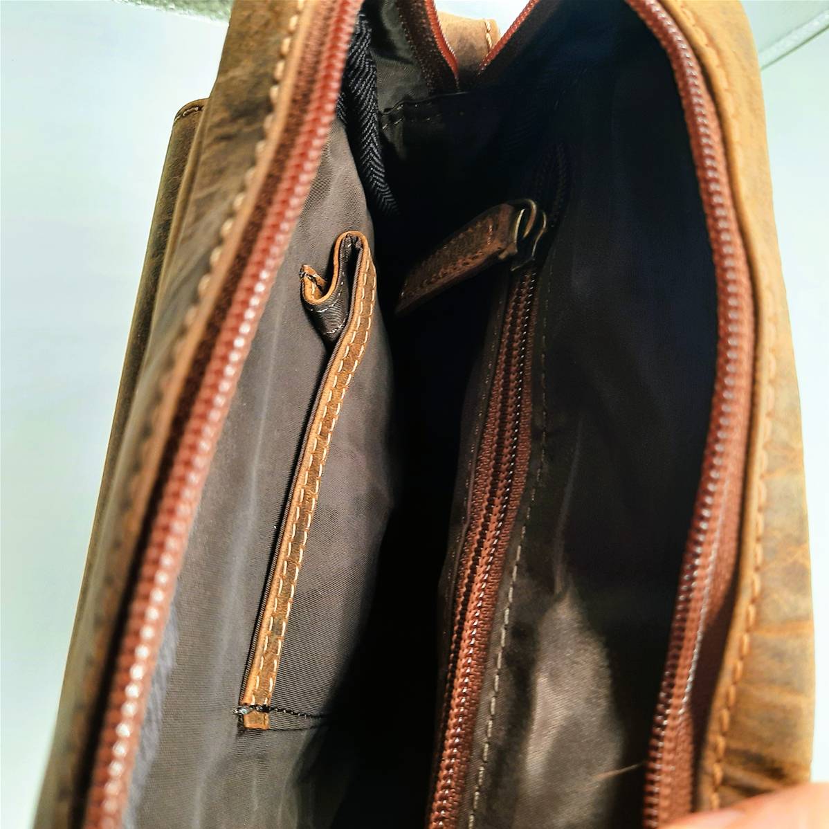 100 % cuir de buffle véritable, doublure textile résistante, fermetures zippées solides, bouclerie métallique finition laiton vieilli et bandoulière réglable renforcée. (120cm max)