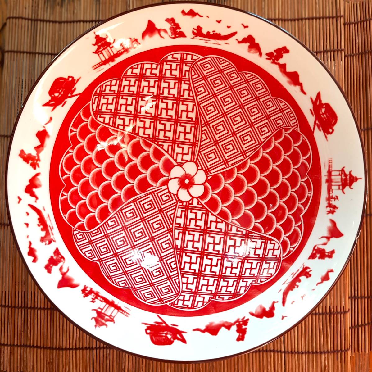 Ce saladier bord paysages rouges “Shanghai” évoque les paysages et symboles d’Asie : pagodes, montagnes et motifs géométriques se mêlent dans un décor rouge vif sur fond blanc. Une pièce d’artisanat authentique.