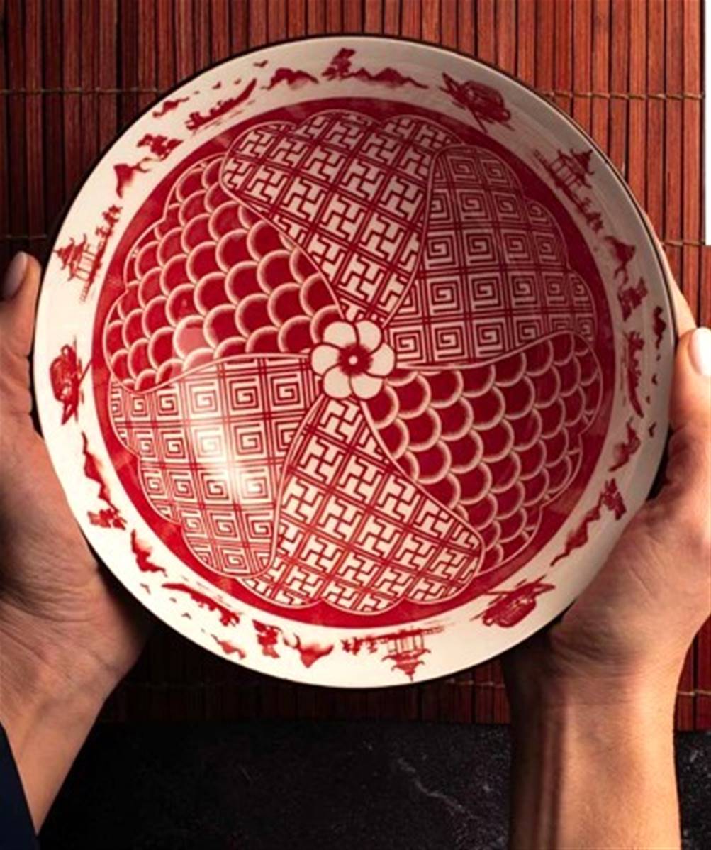 Le centre du saladier présente un patchwork de motifs géométriques rouges – vagues, entrelacs et fleurs – bordé d’une frise narrative évoquant les paysages asiatiques. Le résultat : une œuvre d’art miniature, raffinée et captivante.