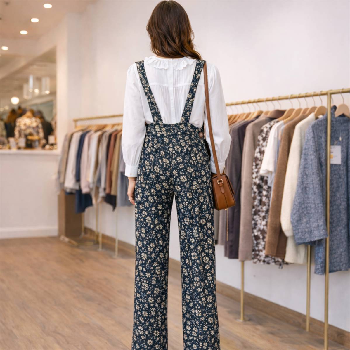Cette salopette en velours bleu marine séduit par son motif fleuri délicat et son esprit rétro revisité.