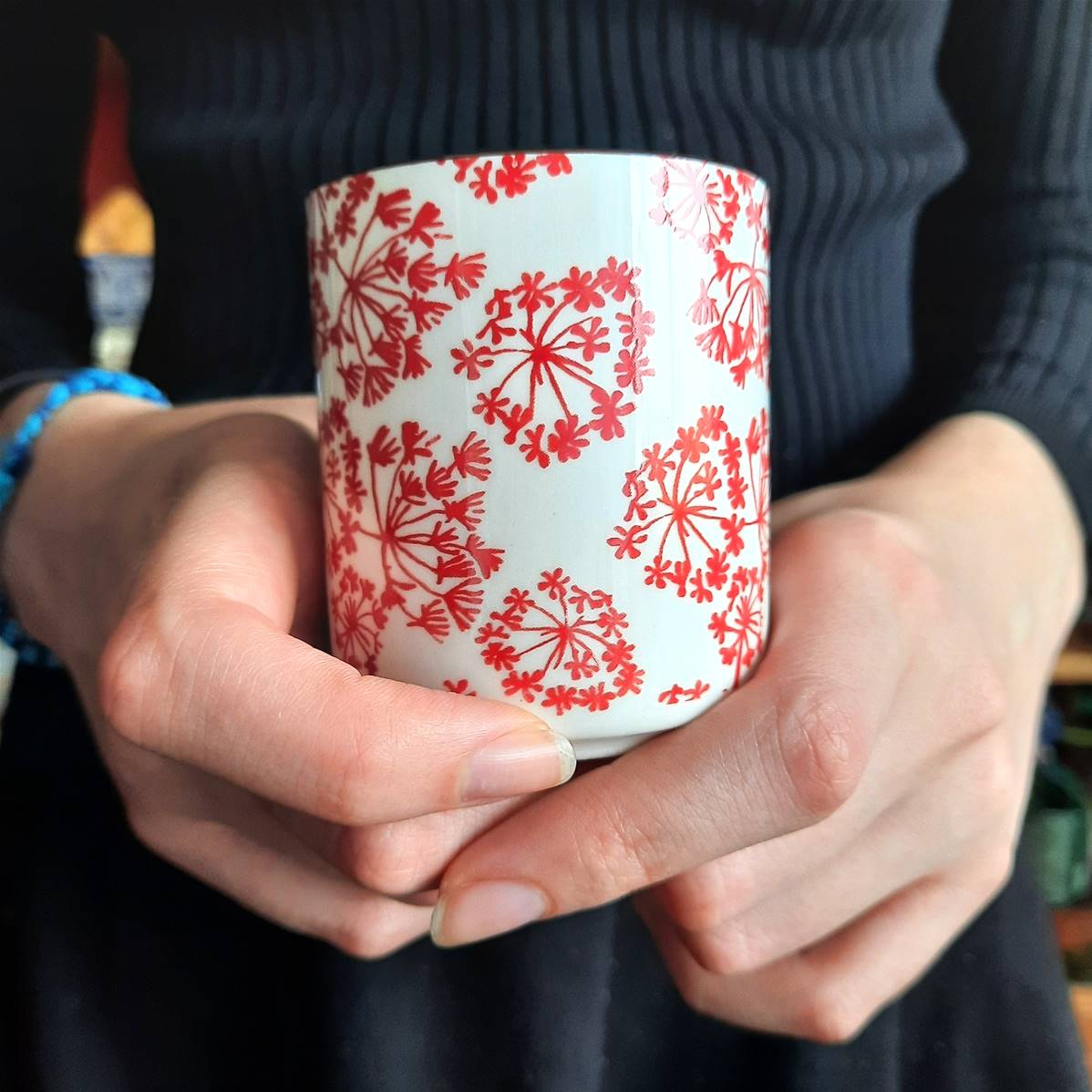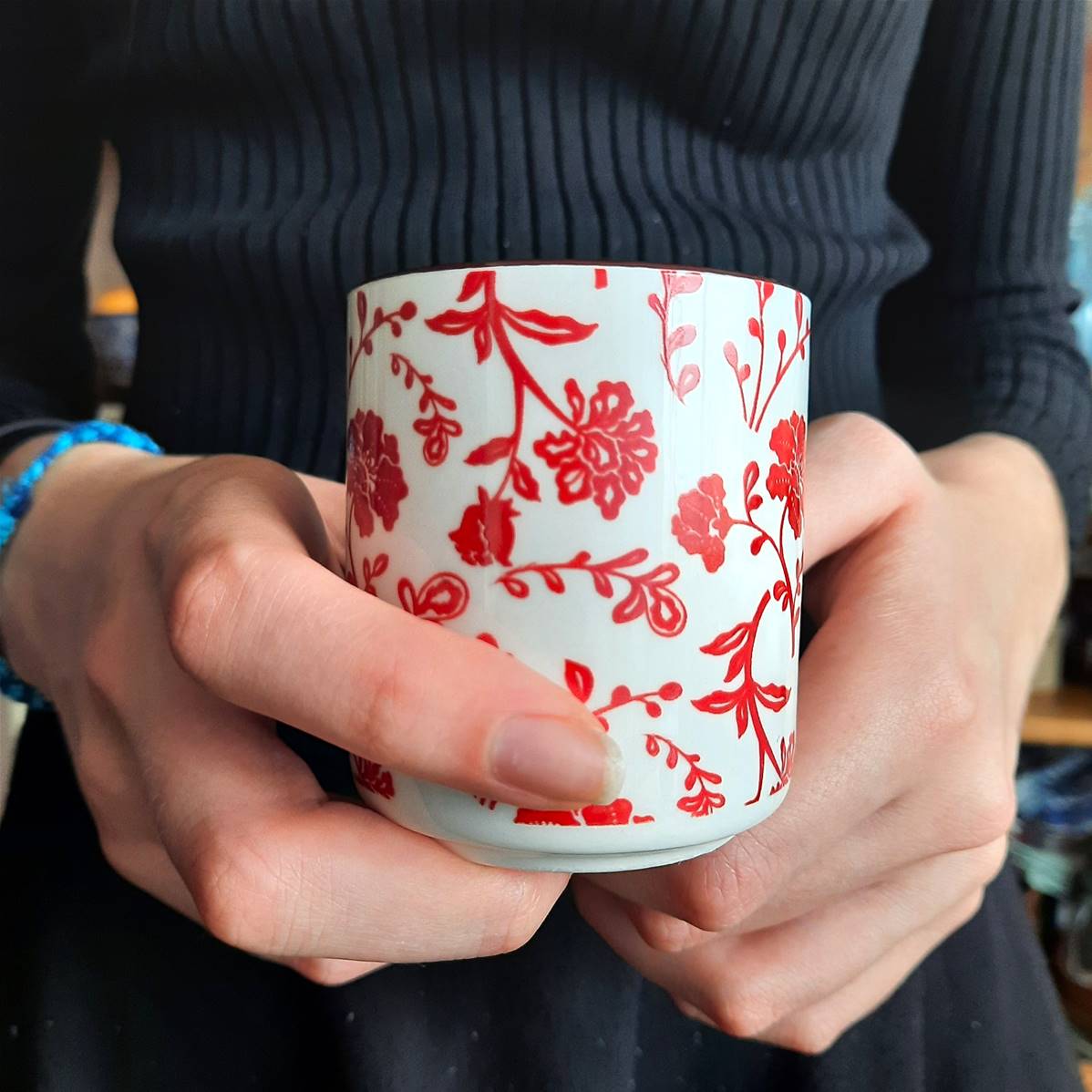 – Une tasse Fleurs des vents rouges, mêlant motifs floraux et géométriques.