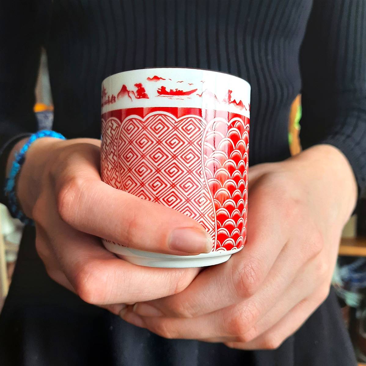– Une tasse Paysages rouges, orné de pagodes, montagnes et symboles asiatiques.