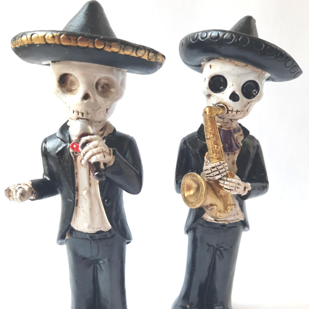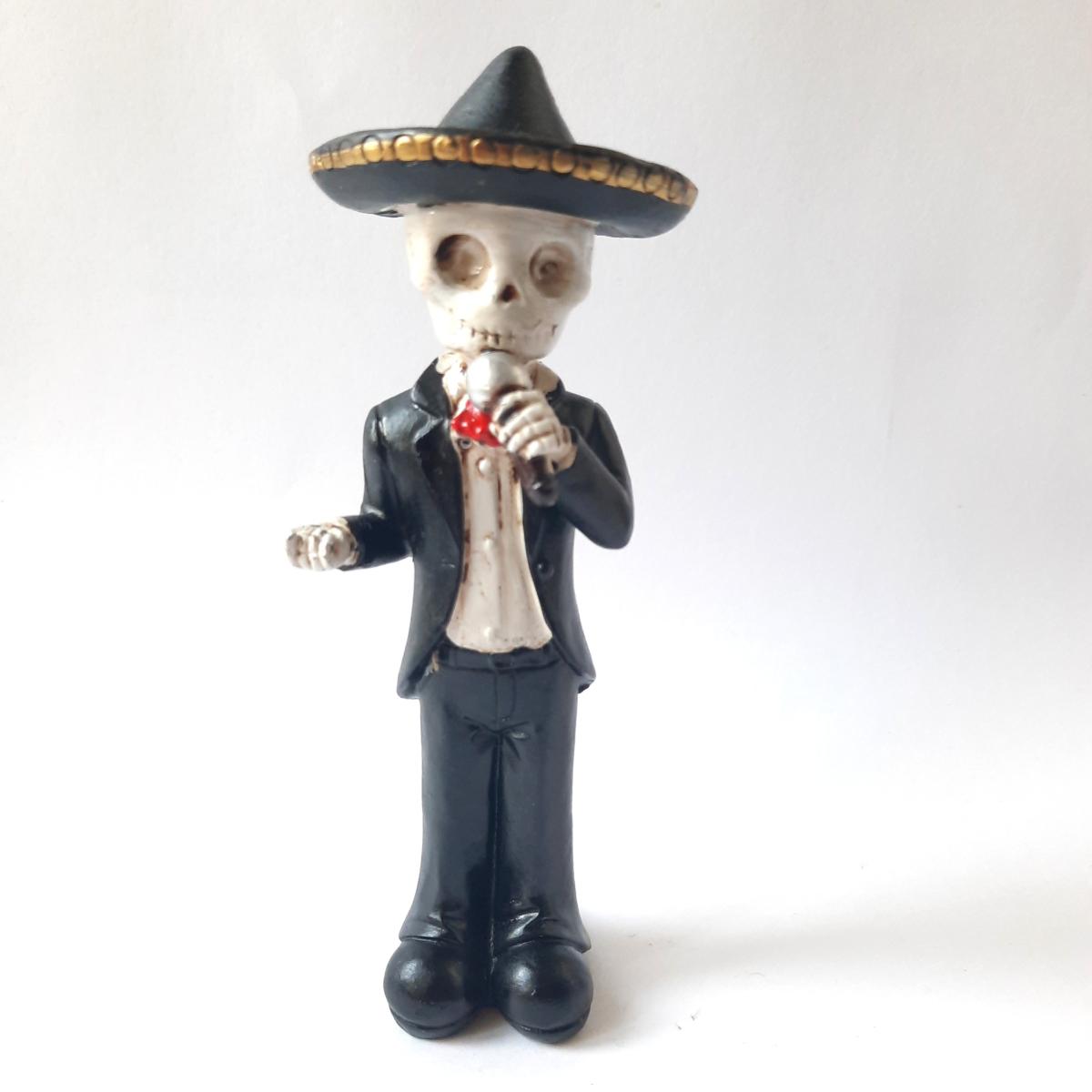 Une figurine originale représentant un chanteur squelette mexicain avec sombrero et micro. Une décoration artistique inspirée du Día de los Muertos, idéale pour un cadeau créatif et insolite.