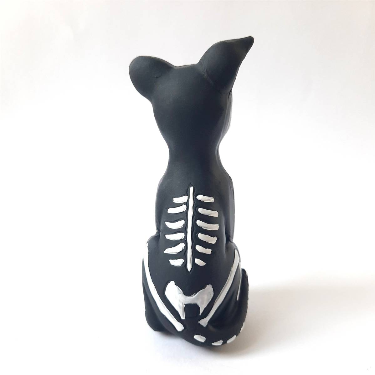 Avec son corps noir décoré d’un squelette blanc et son visage coloré, cette figurine mêle humour, culture et créativité.
