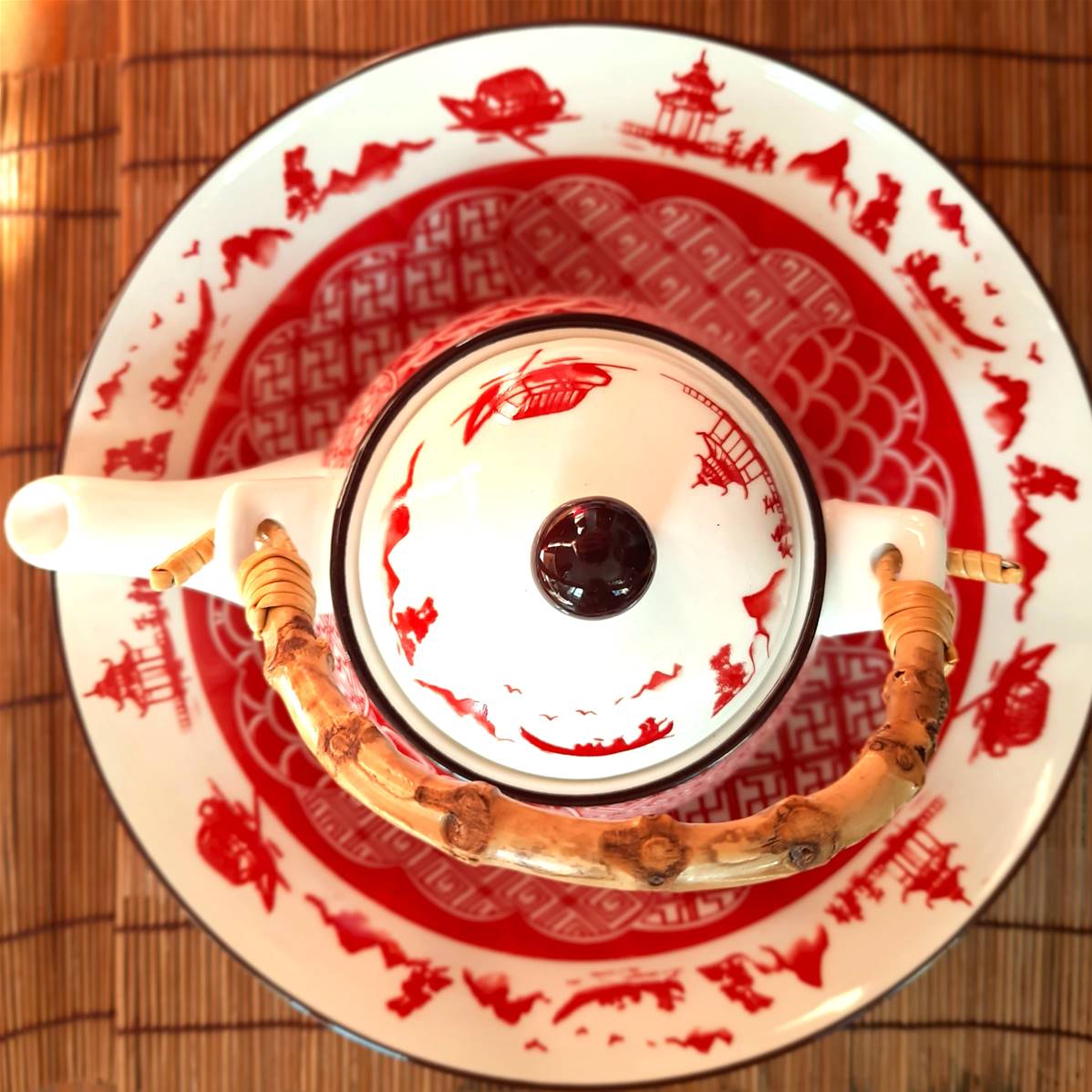 Le motif “bord paysages rouges” est une fresque miniature célébrant la culture asiatique : pagodes, montagnes, jardins et motifs géométriques s’entrelacent avec finesse.