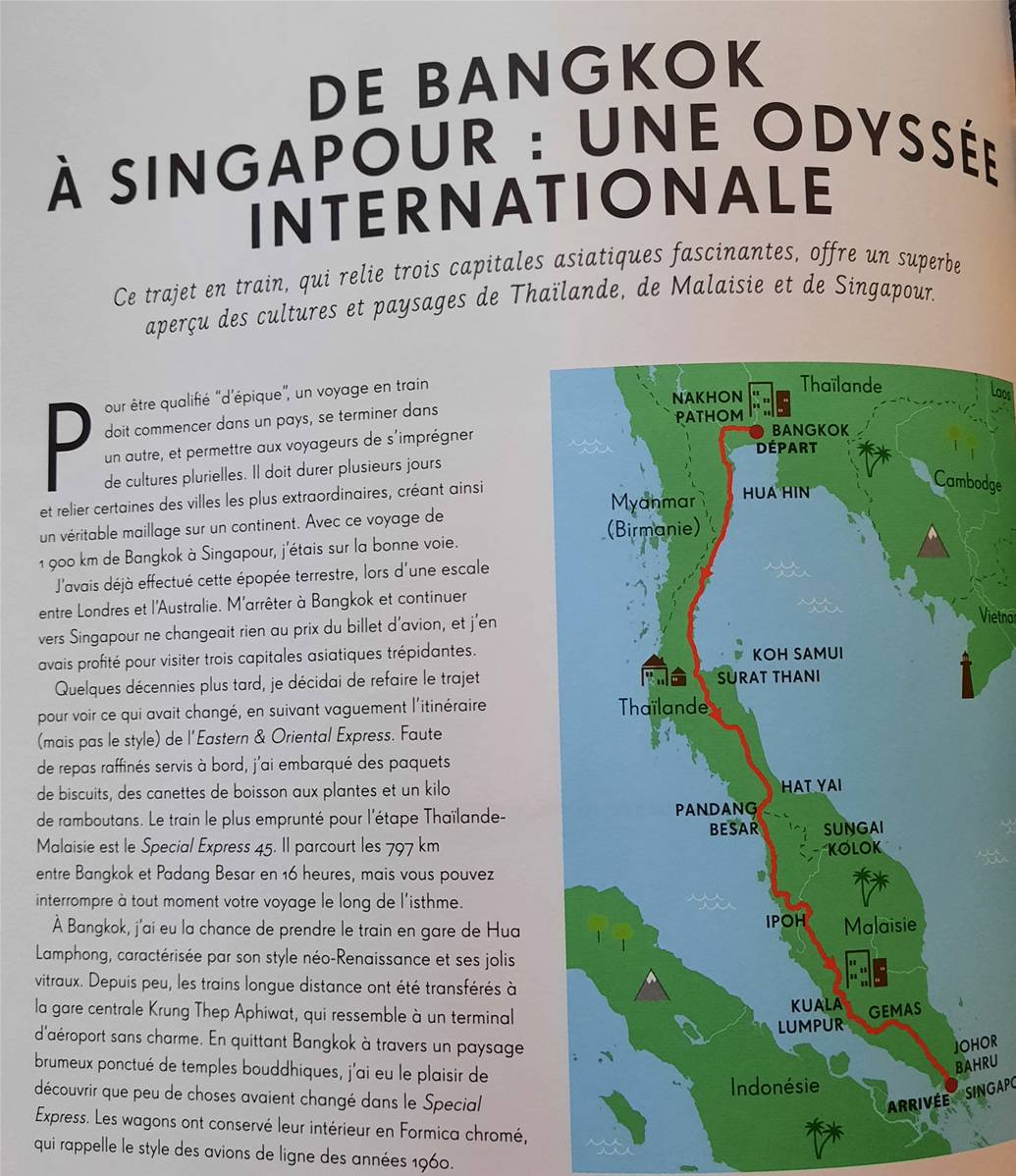 Monter à bord de trains pittoresques tels que le Blue Train sud-africain ou le Maharajas' Express en Inde ; traverser les États-Unis ou l'Australie d'un bout à l'autre ; passer de Bangkok à Singapour ou de la Slovénie à l'Italie ; apercevoir le mont Fuji depuis la fenêtre d'un Shinkansen ; déguster une tasse de maté ou un curry à bord du luxueux Eastern & Oriental Express ; visiter les centres-villes, les monuments et les musées aux alentours des gares... Chaque périple offre son lot d'expériences.
