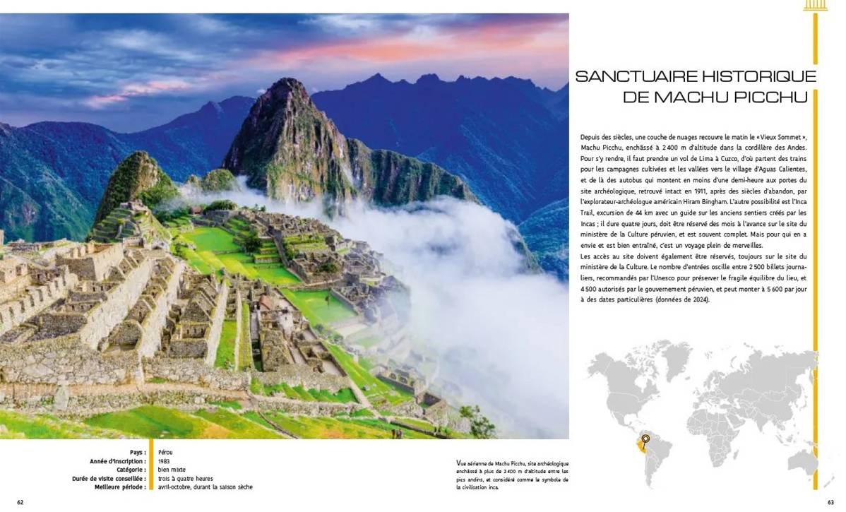Le monde est riche en trésors inestimables. Aussi lorsque l'un d'entre eux, que ce soit un site, un paysage ou un monument, vient intégrer la liste très enviée du patrimoine mondial de l'Unesco, on est assuré qu'il s'agit d'un véritable chef-d'œuvre. Qu'ils soient l'objet même du voyage ou l'opportunité de vivre une expérience inoubliable au cours d'un itinéraire plus vaste, tous méritent amplement le déplacement.