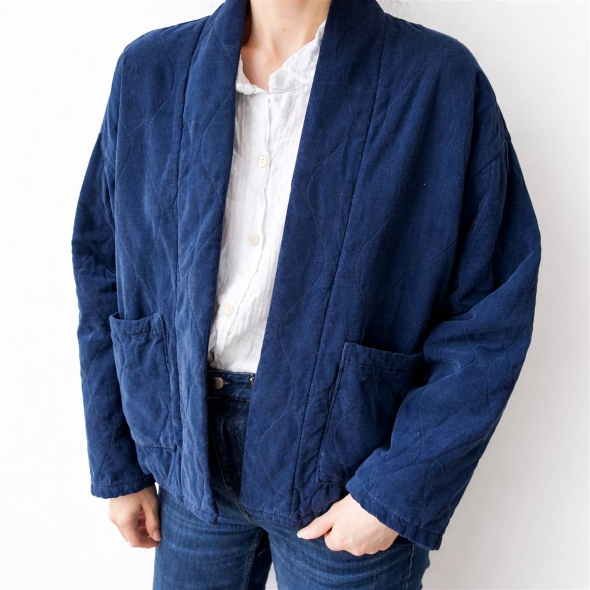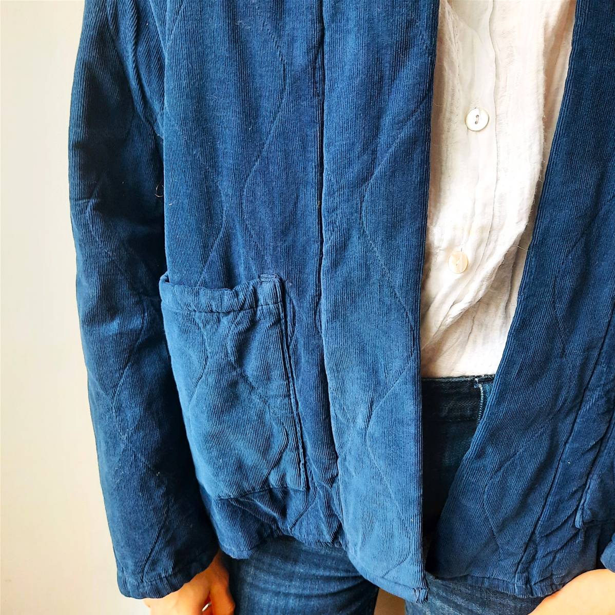 Une veste matelassée en velours côtelébleu marine, à l’inspiration indienne, revisitée avec une doublure vichy, parfaite pour offrir un cadeau original, élégant et authentique.