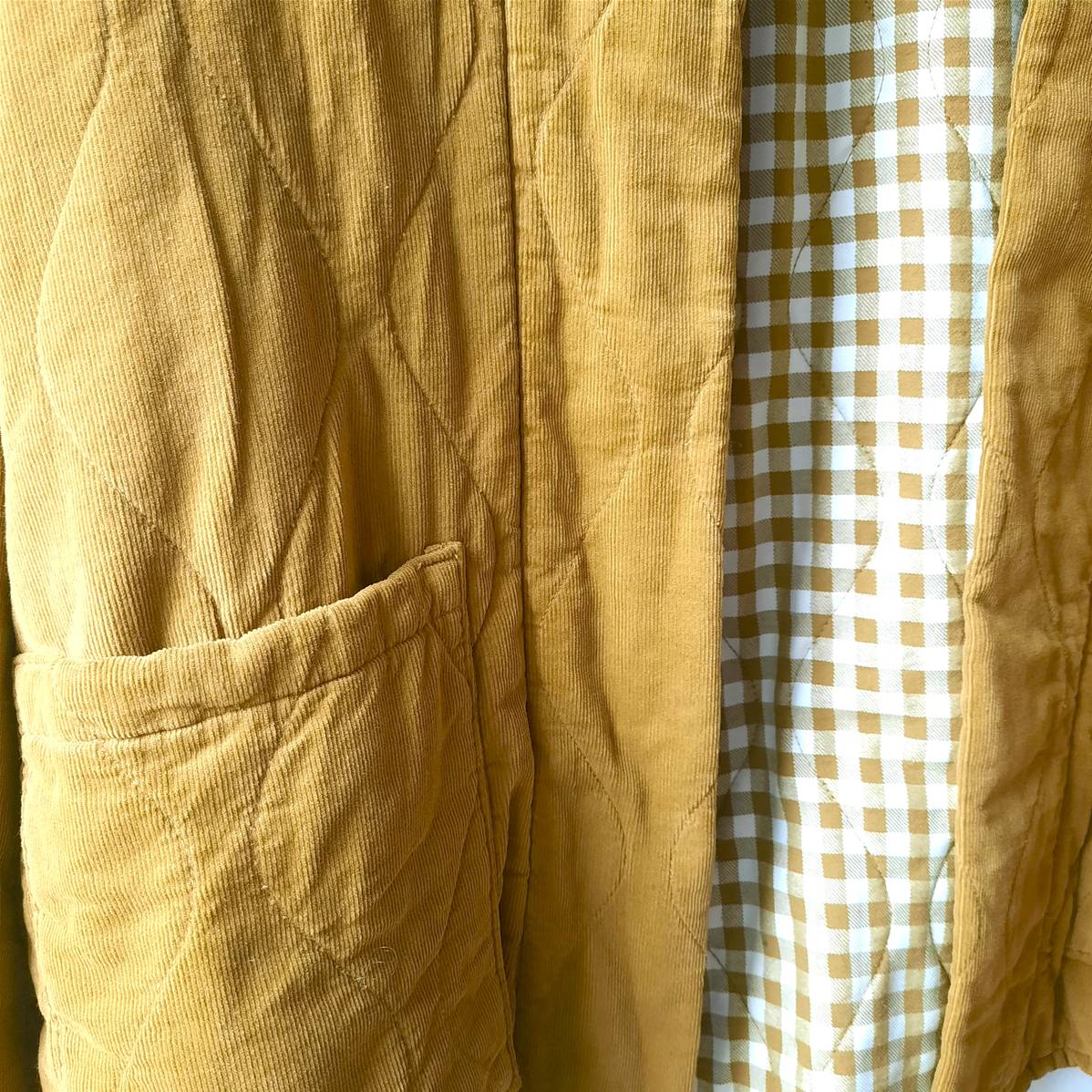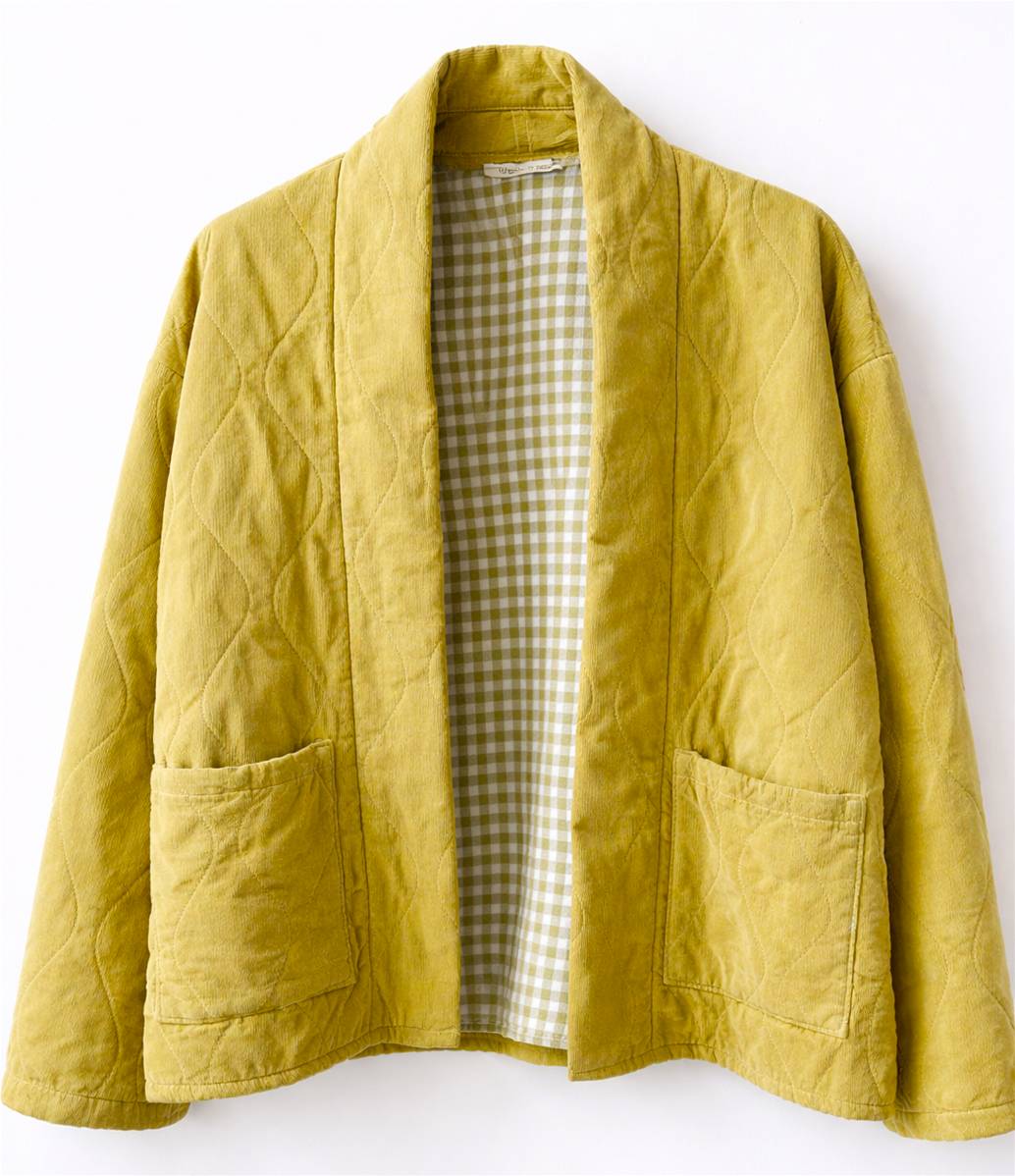 Une veste matelassée en velours côtelé vert anis, à l’inspiration indienne, revisitée avec une doublure vichy, parfaite pour offrir un cadeau original, élégant et authentique.